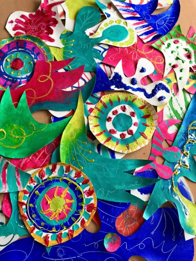【一日一作プロジェクト】コラージュパーツ「春夢芽舞(はるゆめまい)」を作った。各パーツをペイントしては床へ。乾かしながら、色や模様を重ねていく。私にとって