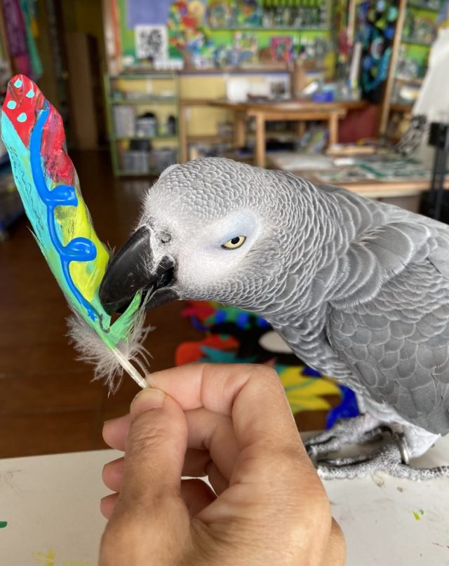 うちのアトリエは、色の洪水。なので、かえって「グレー1色」のオウムは目立つ。ということに、今気づいた。わび、さび、墨絵の世界みたいなオウム。コントラストでいいかも。