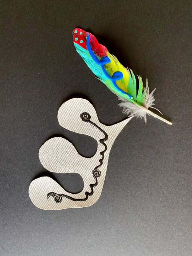 【一日一作プロジェクト】オウムの羽で「くるりん芽」を作った。グレーの羽が1枚床に落ちていたので、つまんでゴミ箱へ。その瞬間