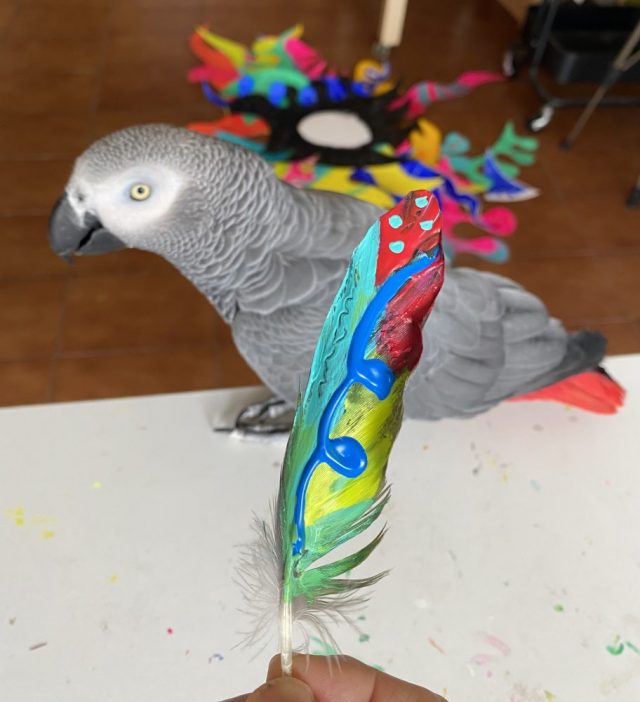 くるくるりんと。踊りながら。伸びていく〜。絵の具を乾かし、いよいよオウムにお披露目。「喜んでくれるかな〜」と期待したものの、わずか数秒で
