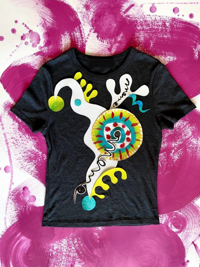 【一日一作プロジェクト】Tシャツアート「ぴかり小道(こみち)」を作った。今日は朝から銀行、郵便局、自然食品店、スーパーを回り、そのまま