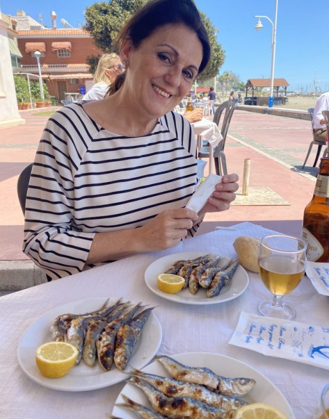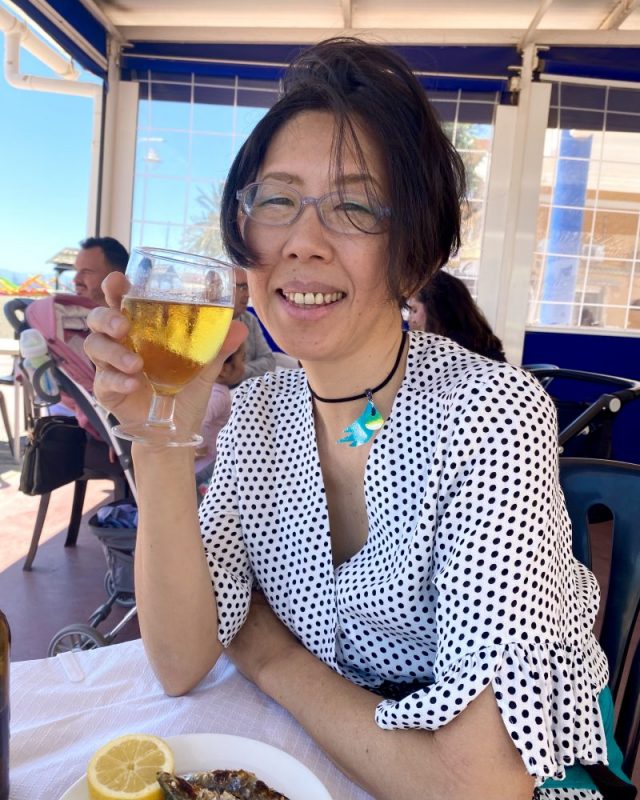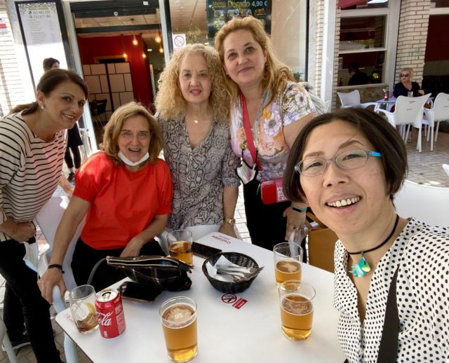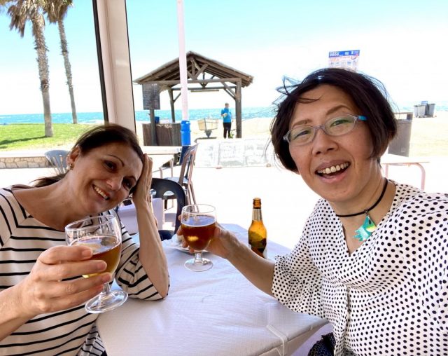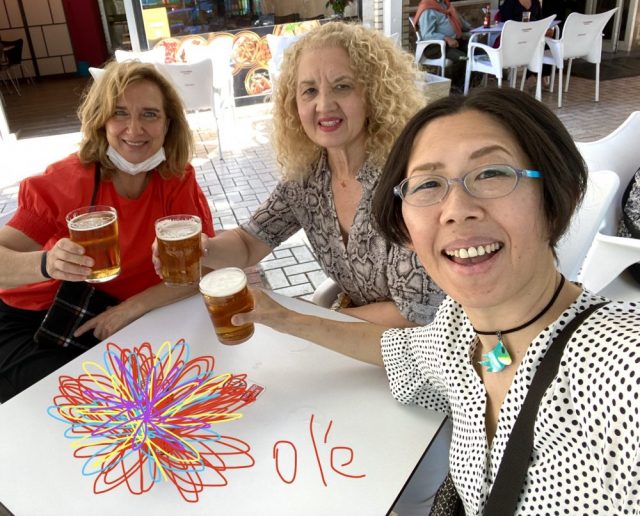 練習してるんだもん。心はいつもフラメンコ。さて。布屋を後にし、一休みのビール。動画作りプロジェクトの成功を祈って乾杯。さらに。近所に住むインマと、帰りにイワシランチ。