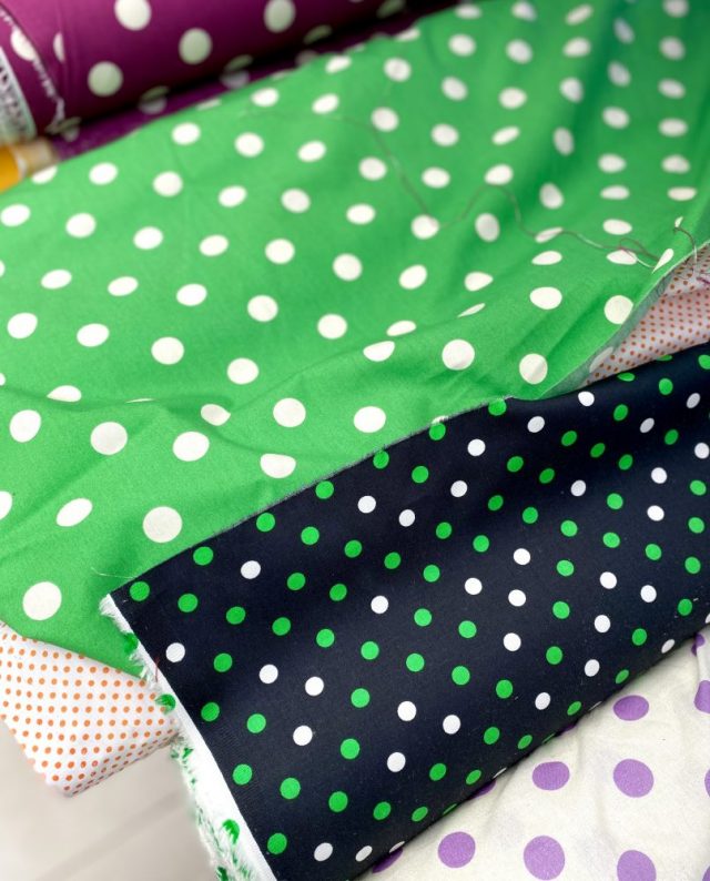 駆けつけてみれば、こちらにも。私の心をがっしりつかむ「緑・白・黒の水玉」生地2種類(写真)。1メートルなんと500円弱。これなら心おきなく3メートルとか買える〜。