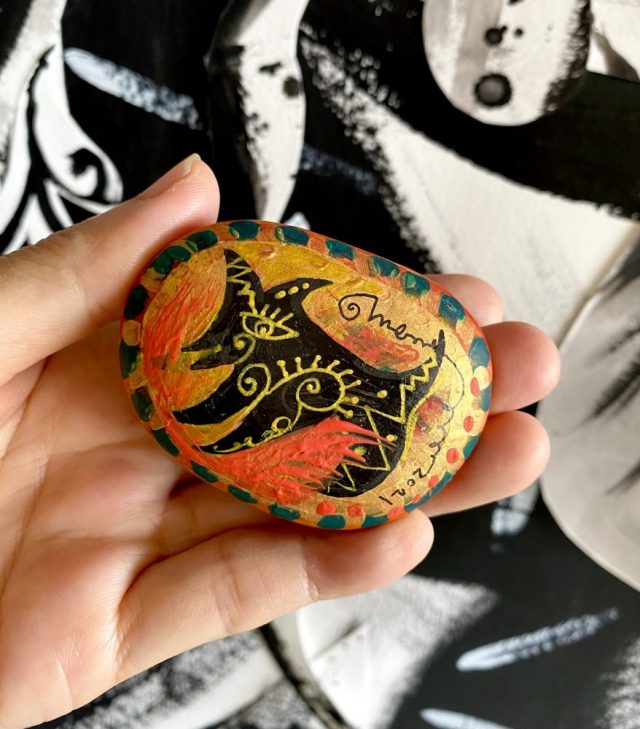 【一日一作プロジェクト】浜辺で拾った石にペイントして「炎のゆりかご」を作った。ダンス仲間とマラガのセルバンテス劇場へ!本日のプログラムはサルスエラ。