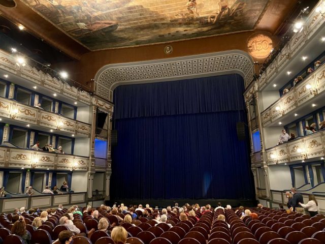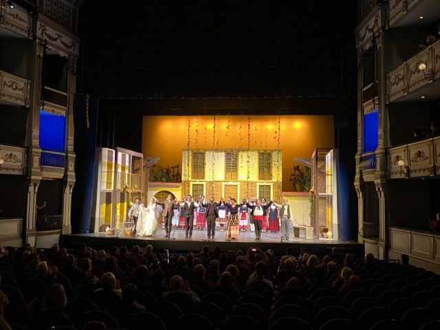 豪華じゃ〜。定員は6人だけど、3人で貸し切り。コロナ規制でいいことも。さて。本日の出し物はサルスエラ「La del Soto del Parral」。あらすじをさっそくレクチャーしてもらう。