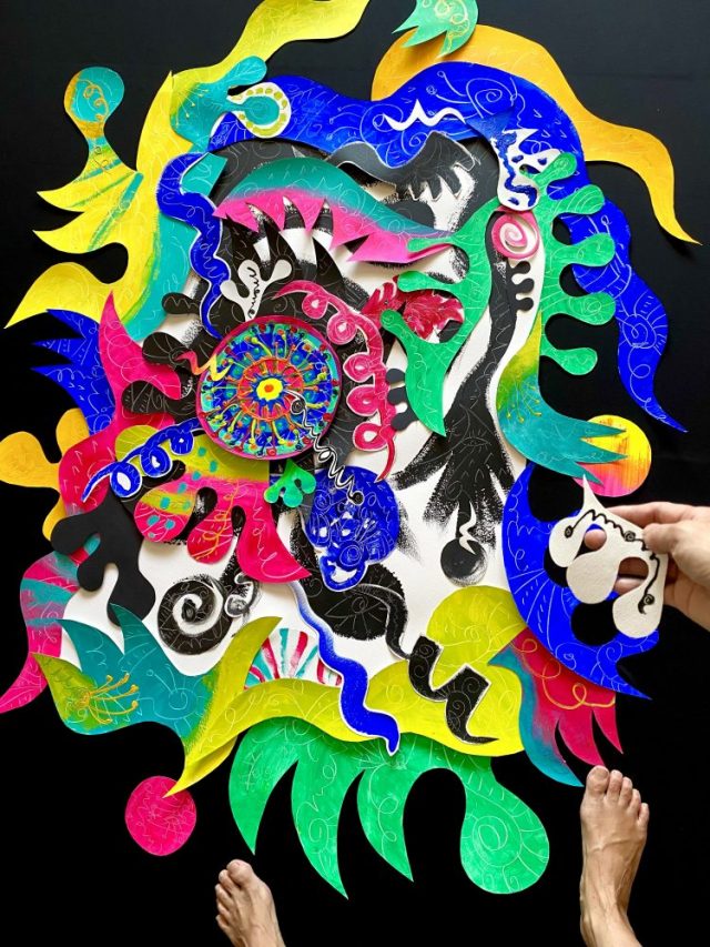 太陽神が、歌や音楽、笑い声に誘われ、そっと戸を開ける。まさに太陽と音楽(笑)。そのシーンがぱっと脳裏に浮かび、さっそくコラージュアートを開始。