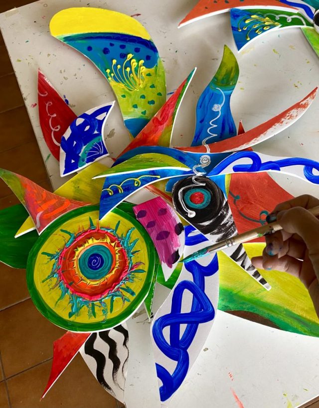 を制作中(写真)。残り物のキレハシをボンドでくっつけ、さらにペイント。キャンバス地や紙に描く時と違い