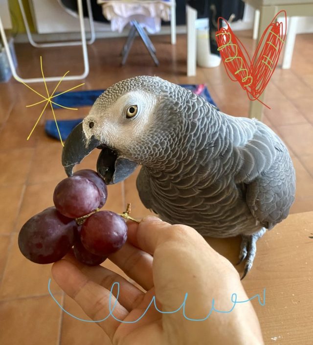 (作品の上の部分が、オウムにかじられてギザギザに。もしかしてコラボ?)