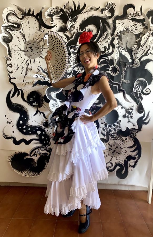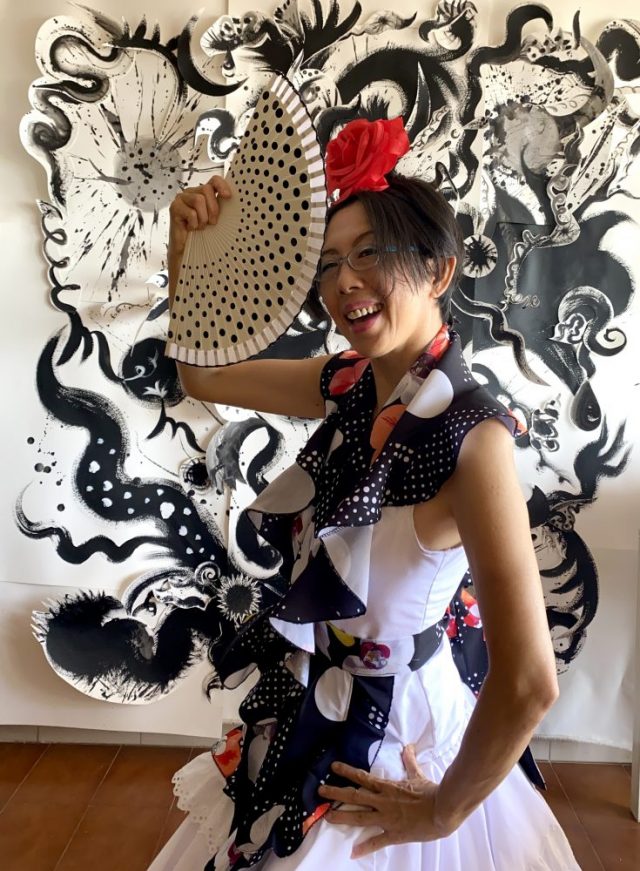 【一日一作プロジェクト】フラメンコ衣装で「龍風舞(りゅうふうまい)」を作った(撮影)。マラガでは夏になると、多くのご婦人がバッグの中に