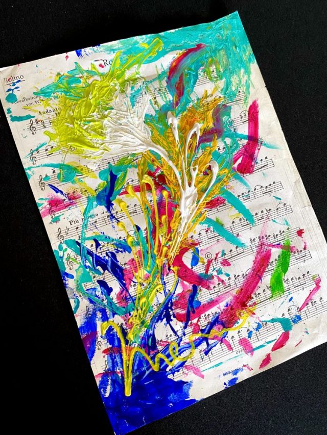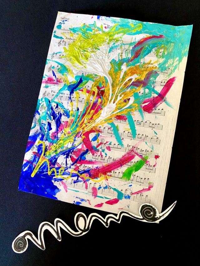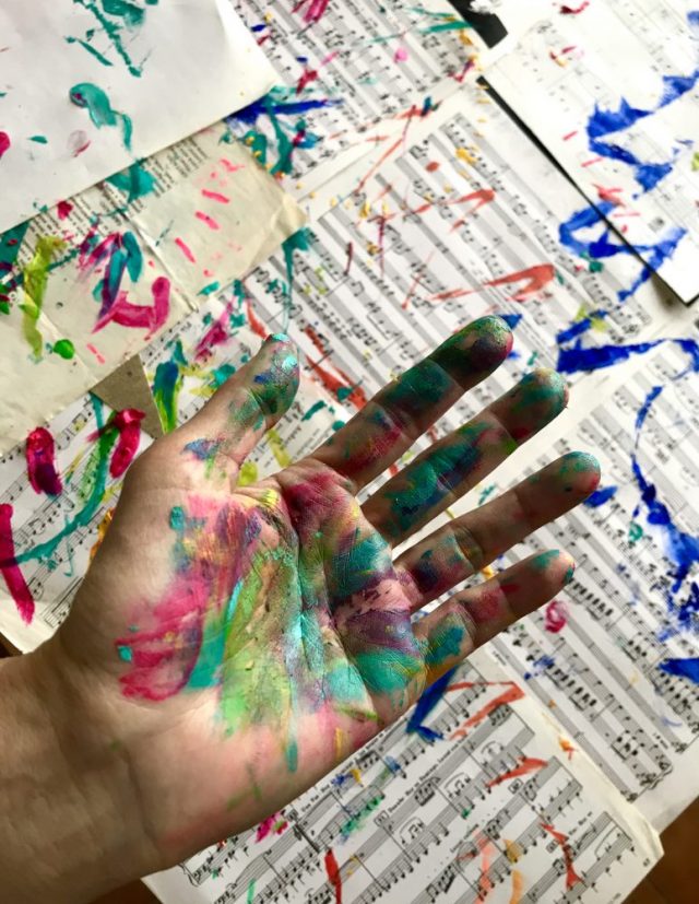 【一日一作プロジェクト】楽譜にペイントして「花しぶき」を作った。実はこれ、別の作品をペイントするための「下敷き(テーブルカバー)」だった(写真)。