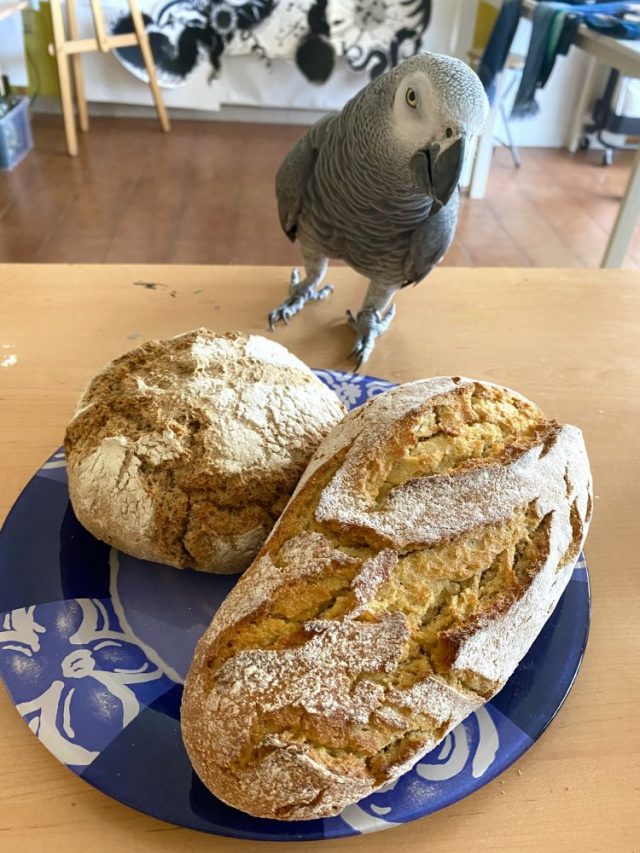 我々は2部制なのだ。宅配サービスがない限り。さて。焼きたてパンなど買いながら、すっかり幸せ気分に。さっそくオウムも飛んでくる(写真)。