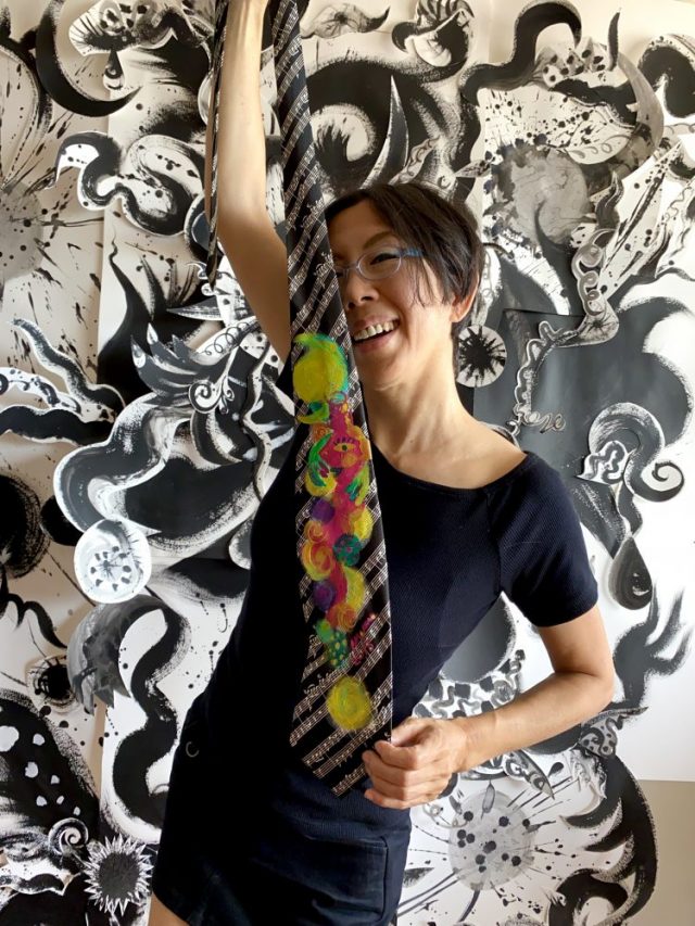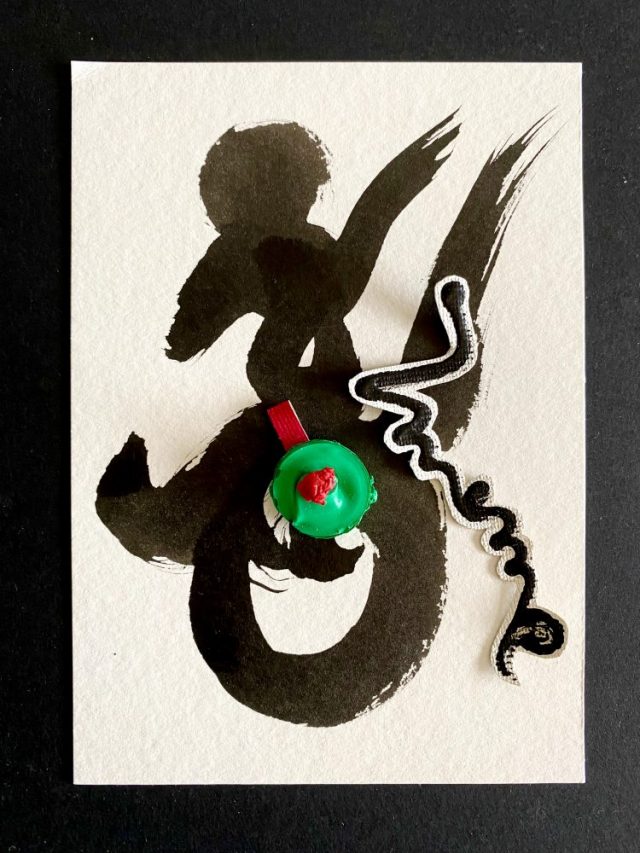 笑。何でも素材に見える〜。カリグラフィアート「音」文字に、ゴミから復活した「音玉」を組み合わせて。まさかこんな作品が生まれるとは。