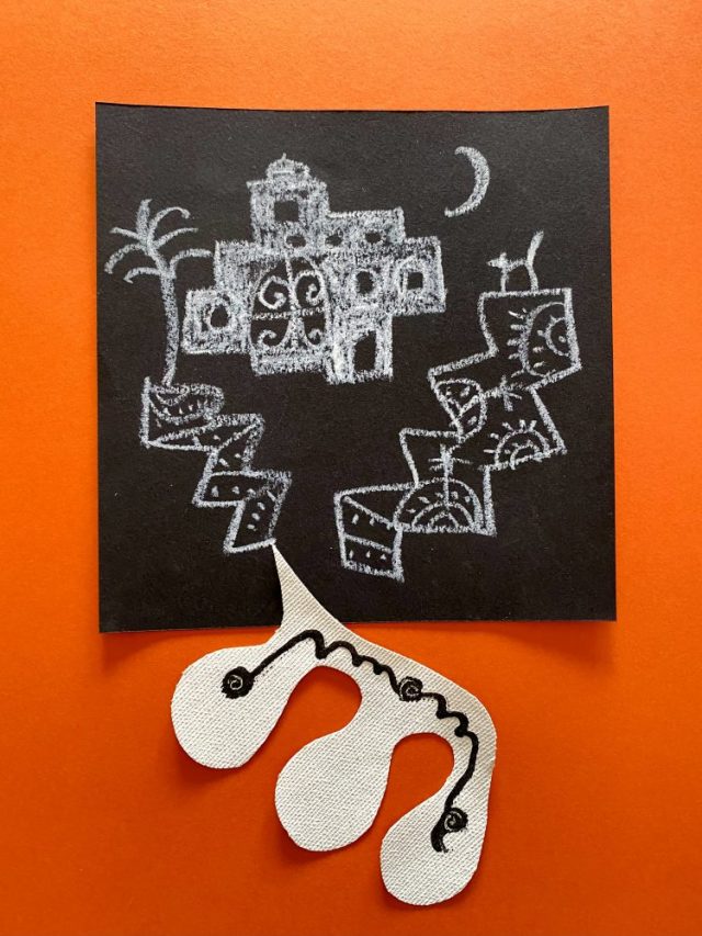 黒い紙に白いクレヨンで。まるで、黒板にチョークで描いたような。ももパーツが加わり「あっちの世界とこっちの世界」が、ひとつに結ばれる。