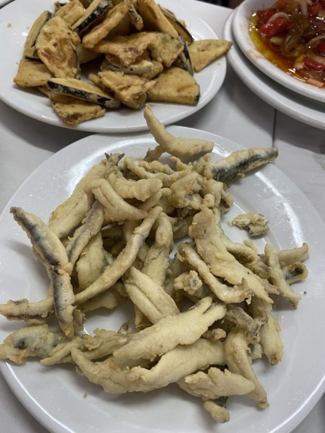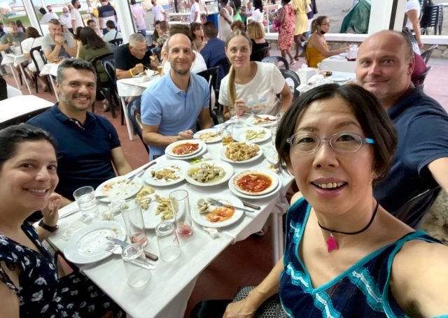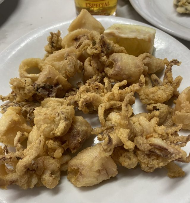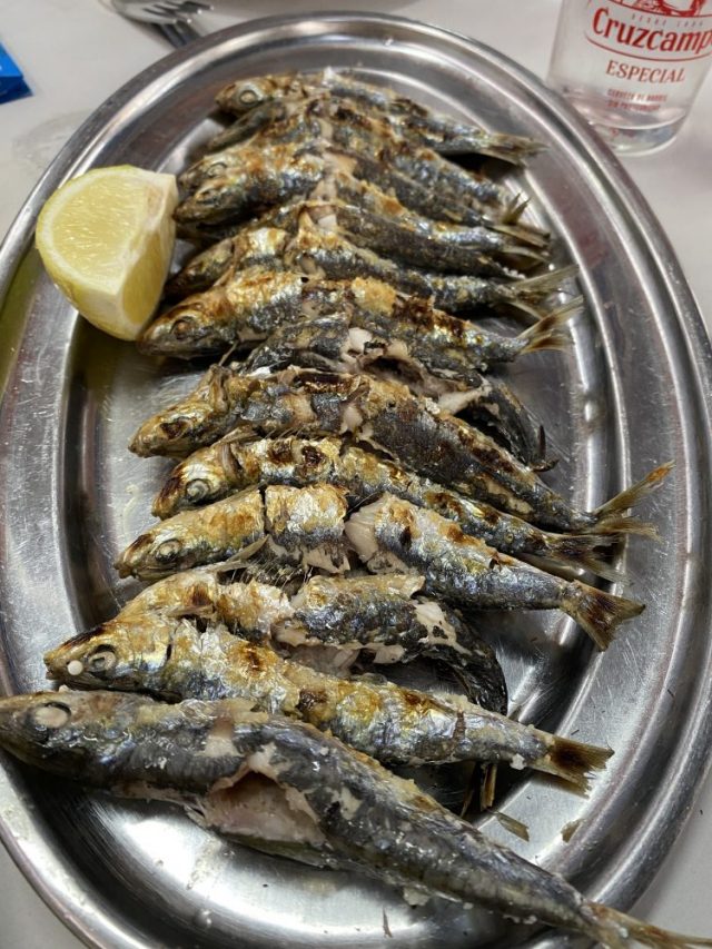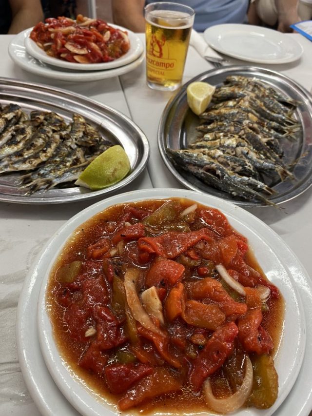 再会が、何よりの贈り物。まずは焼きイワシ。赤ピーマンのサラダ、イカフライ、アサリ、ナスのフライ・・・どれもおいしい〜。スペインの夕食は遅く、8時半〜9時スタート。