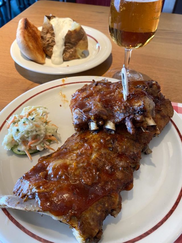 珍しく超肉系レストランへ。がっつりスペアリブに喰らいつく(写真)。ボリューム満点。付け合わせはポテトのオーブン焼き、ニンニクトースト、サラダ。これがビールに合う〜。