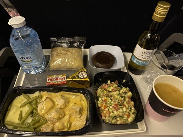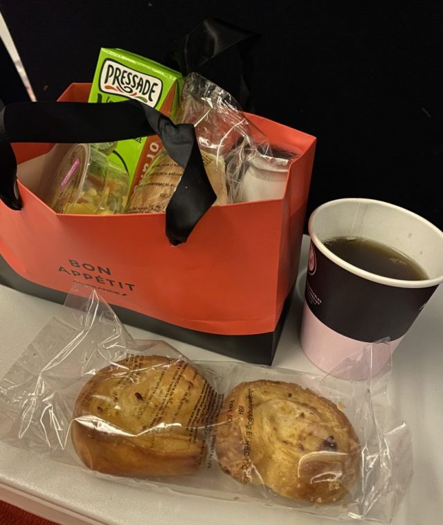歯を磨き顔を洗い、席に戻ると機内アナウンス。「ただ今より朝食をお持ち致します」。なんと食べて寝ただけ。朝食はこんなかわいい紙のボックスで(写真)さすがエールフランス。おしゃれ〜。