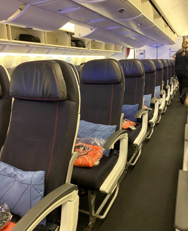なんという贅沢。前後左右すきすき(写真)。乗客はそれぞれ3人席、4人席をどかんと占領。これなら日本までゆったり体を横にして寝ることができる。
