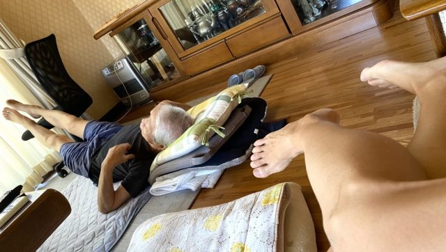 はてしないな(笑)。額縁って、重いんだよね。誰が始めたんや〜。さすがに疲れて、ランチの後は2人で昼寝。居間にひっくり返る(写真)。