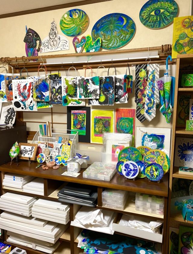 楽しんでやっている姿を見て、見習わなければと思いました。作品保管棚、ショップのようです。