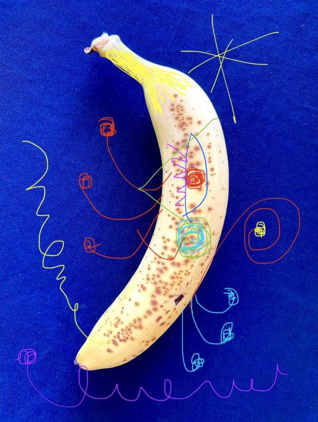【一日一作プロジェクト】おやつのバナナに楽描きして「笑福(しょうふく)」を作った。「日本上陸記・30」。東京駅に無事到着。「成田エクスプレス」に乗り換え、成田空港へ。