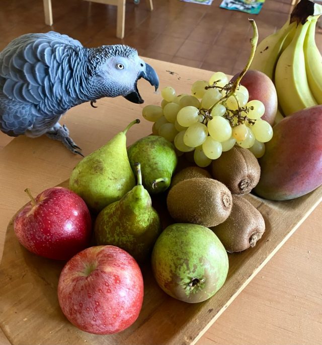 テーブルに置かれたフルーツ盛りをオウムが発見。一目散に飛んで来る〜(写真)。さて、ここで問題。この後、オウムはどうしたでしょう。ヒントは