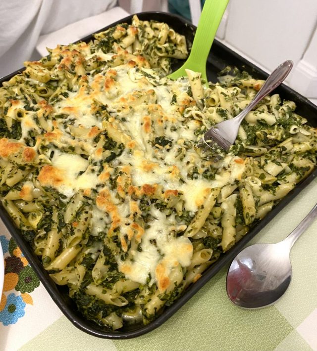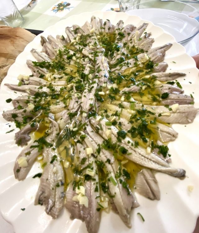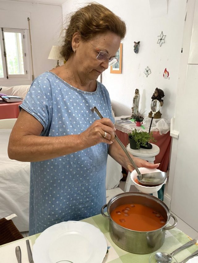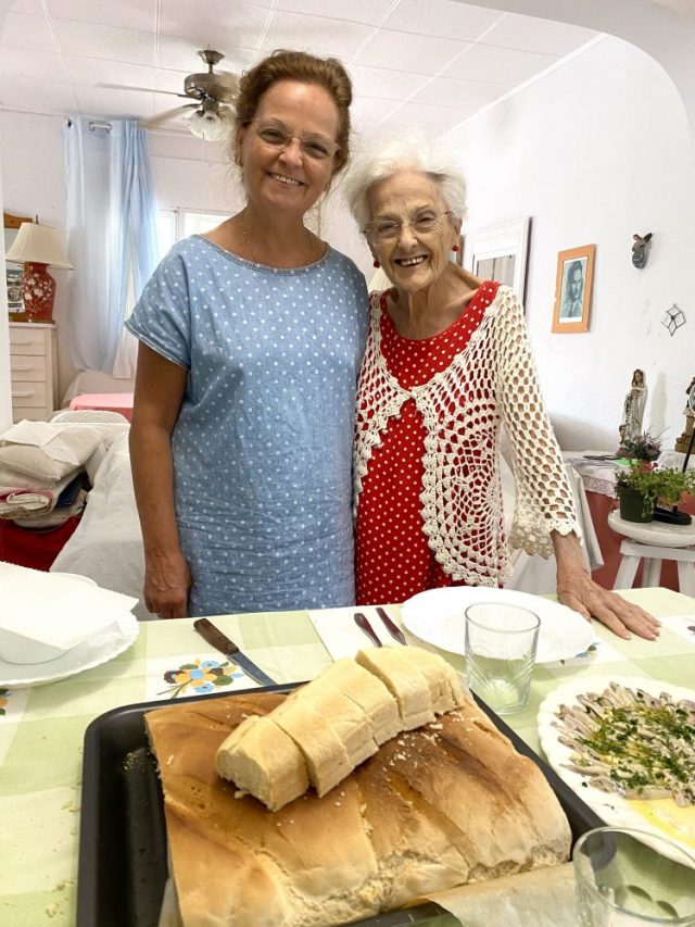 日本語で高らかに(←ハビ吉と私)。イワシの酢漬け(+ニンニク・オリーブ油)、ガスパチョ(生野菜のスープ)、焼きたて手作りパン、ほうれん草のマカロニ・チーズがけ。