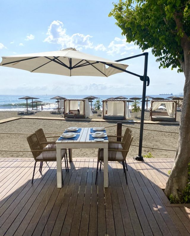 浜辺の中に作られたテラスデッキ。その上にぽつんぽつんと離れて置かれたテーブル。肌を撫でる海風、波の音、木陰に抱かれて、予約席に座る。