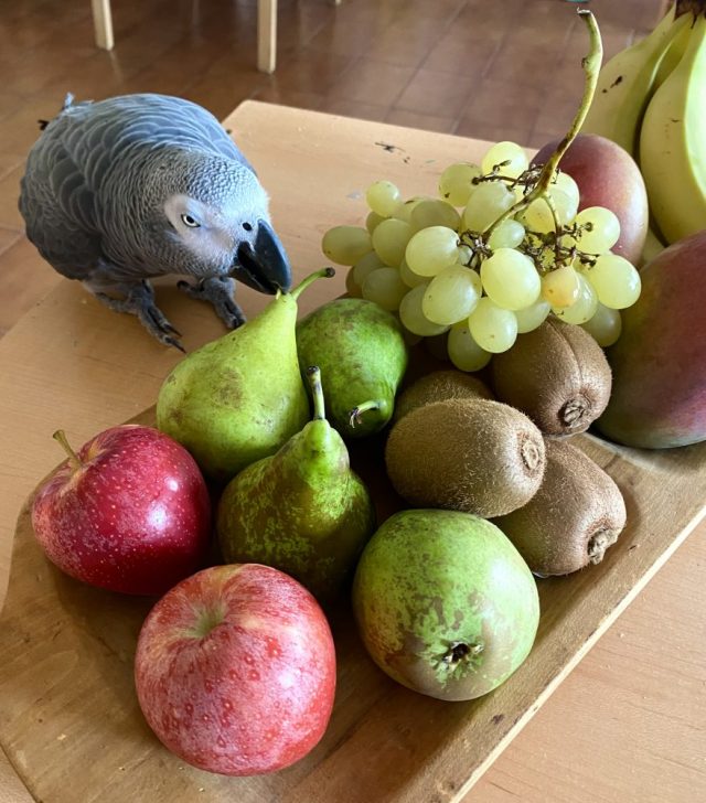 ところも大きい(←ものぐさ)。先日、オウムが「フルーツ盛り」に突進。横目で見ていると、盗み食いをした3点は