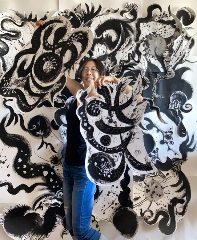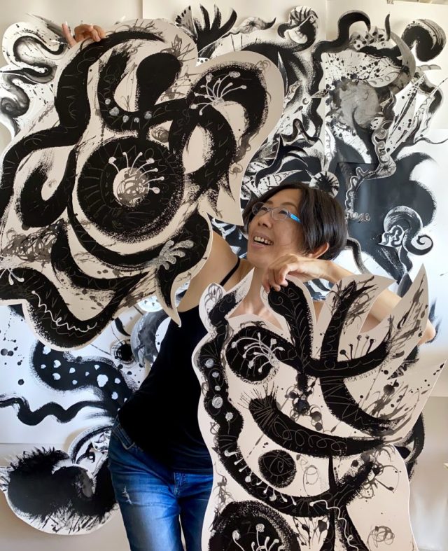 カリグラフィアート「祭」「芽」という文字が、ひとつになって舞い踊る。青い空、青い海で、生き物たちの命の芽がのびのびと育つ。それこそが、祭だ。