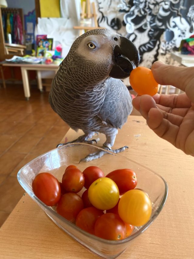 そして。オウムは「トマト」をフルーツだと思い込み、勢いよくかじりつく。野菜だとわかり、いきなりトーンダウン(笑)想像してた味と違う?