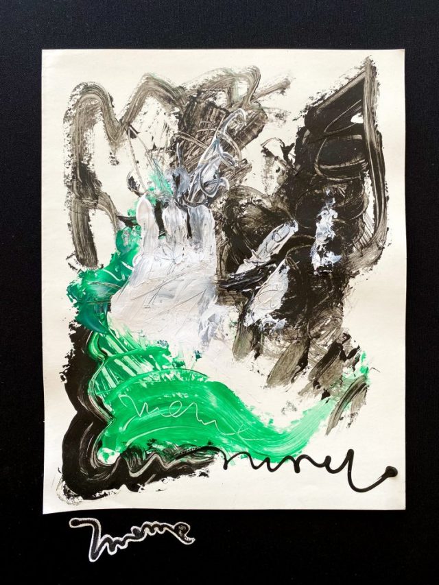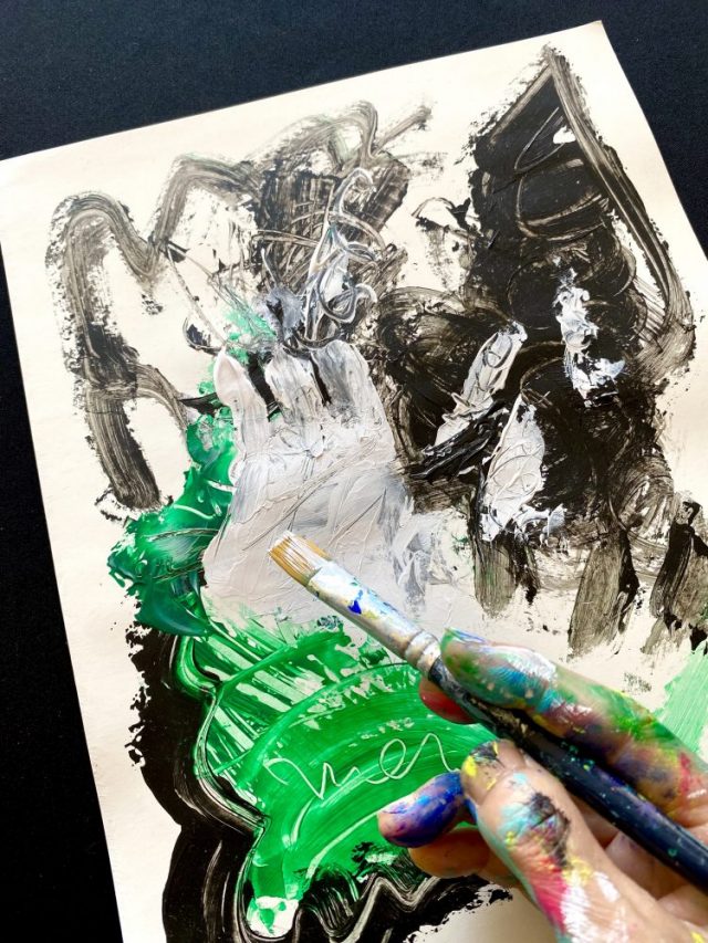が1つになる、あの「爆発するような瞬間」を描きたかった。そこらにあった紙を引っつかんで一気にペイント。よく見たら、ばらした本の1ページ。