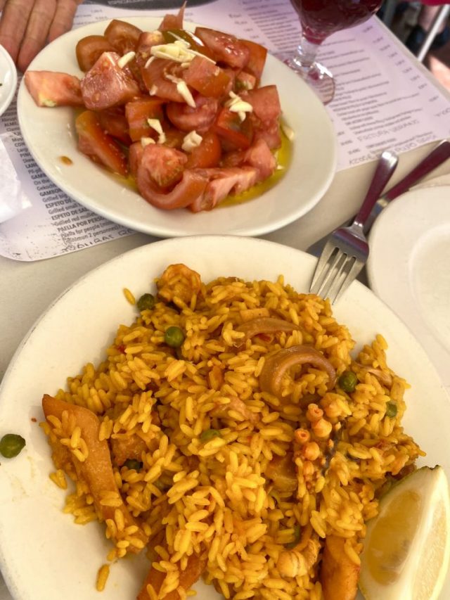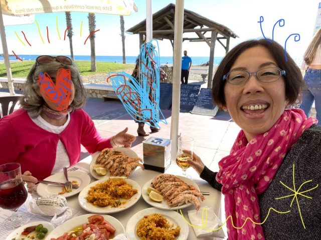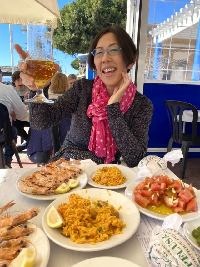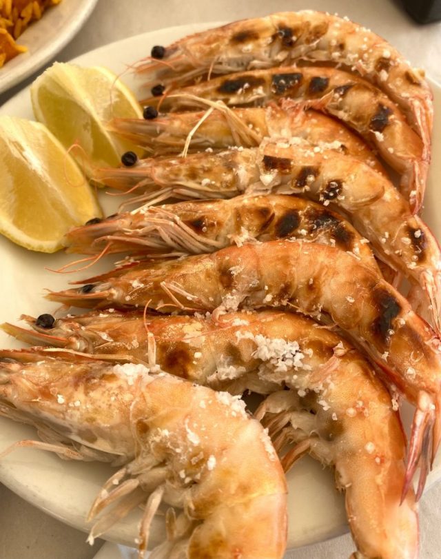 これぞ、祝いの宴。テンション上がる〜。炭火焼きの大エビは、ぷりぷり熱々でめちゃうま。これで1皿8ユーロ(約1000円)。ビールが進む〜。