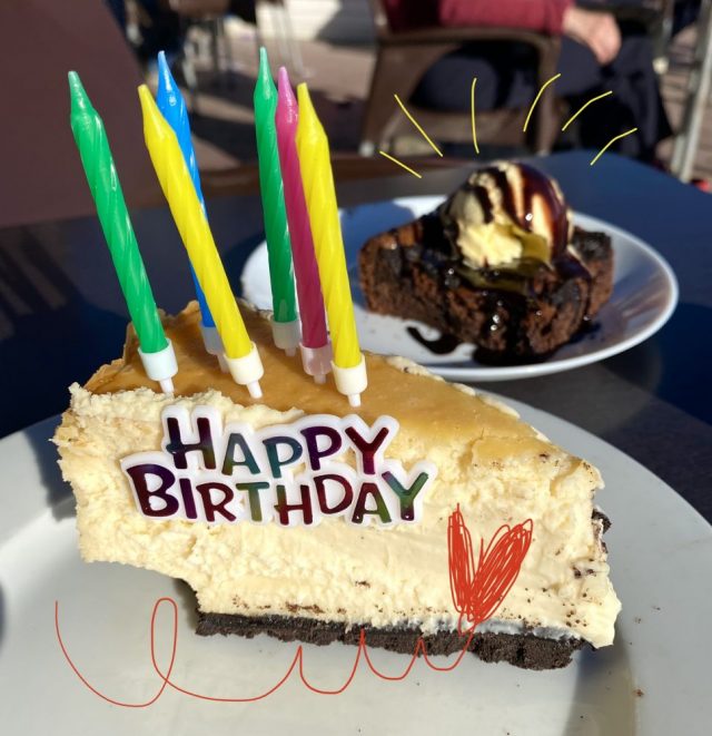 2次会はカフェテリアのテラス席で。太陽をさんさんと浴びながら、大きなチーズケーキ&チョコレートケーキ(←まだ食べるんかい)。お兄さんがろうそくに火を灯してくれる。