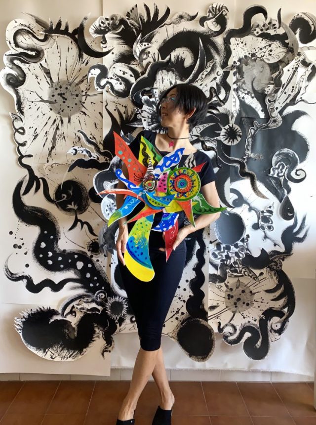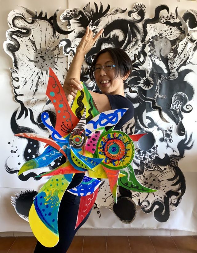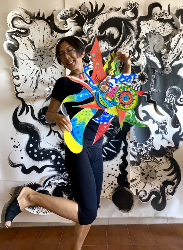 指輪アート。青い空のしぶきが舞い飛ぶ。祈るような気持ちの時、私はよく天を見上げる。イタリアで今起こっていることに愕然とし、強く心を引き締める。