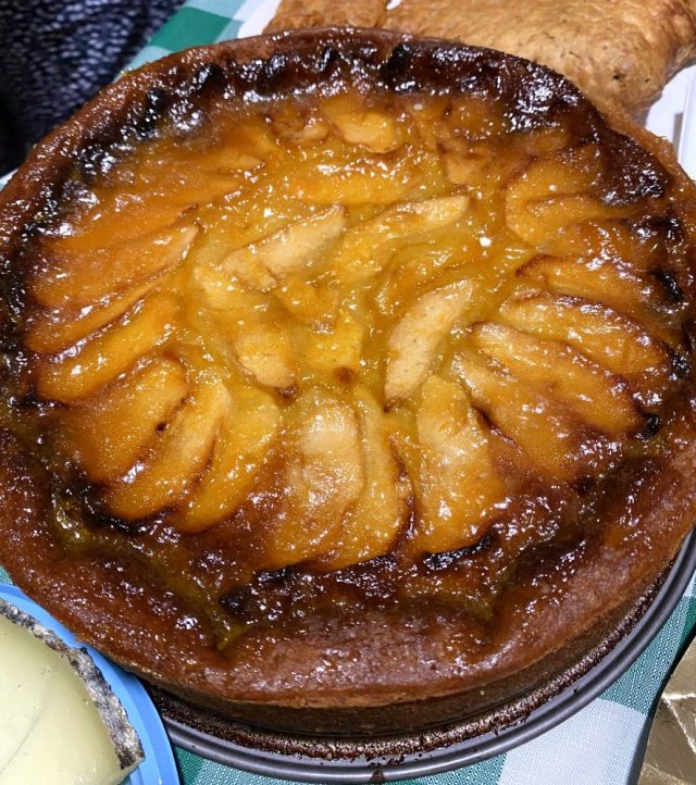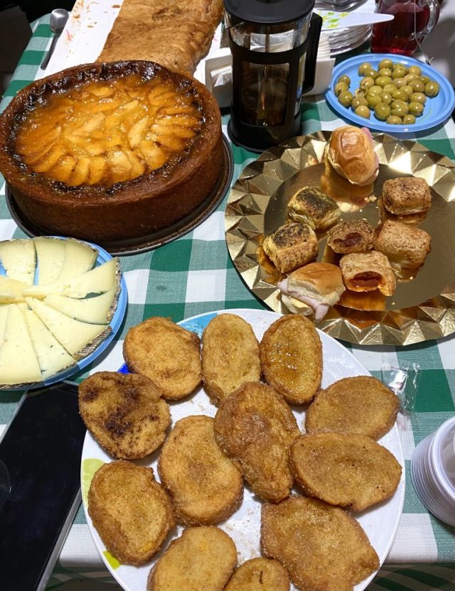テーブルがどーん。ケーキがばーん。手作りのりんごケーキ、トリハ(フレンチトースト)、ミートパイ、チーズ・・・みなさんの手にはシャンパンが。