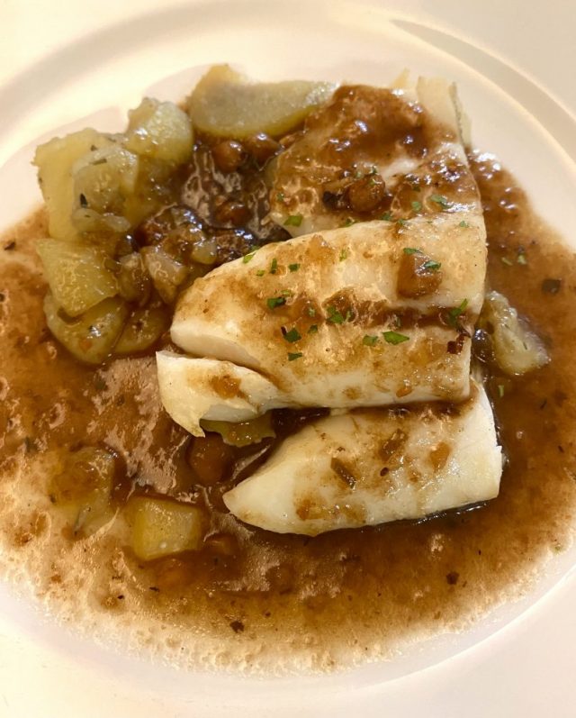 自然と笑顔に。小皿をもらい、半分こ。さらに「白身魚のソテー&なんとかソース」と「ドラダ(魚)のオーブン焼き」。これももちろん半分こ。