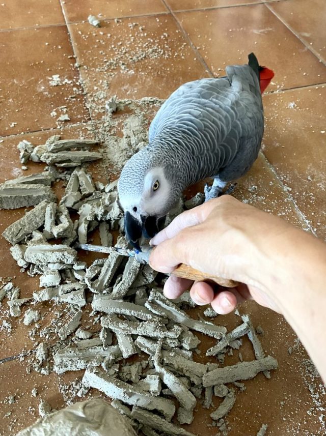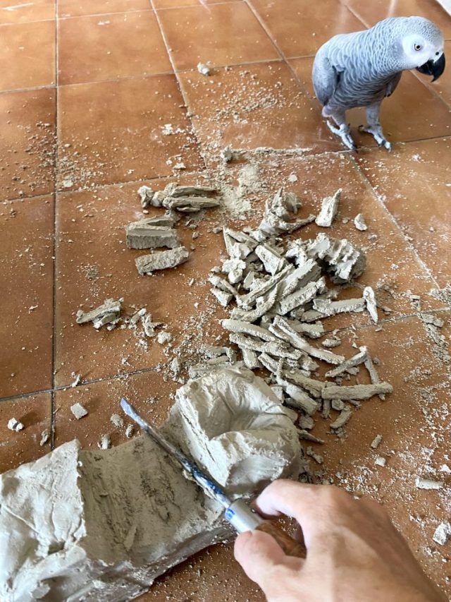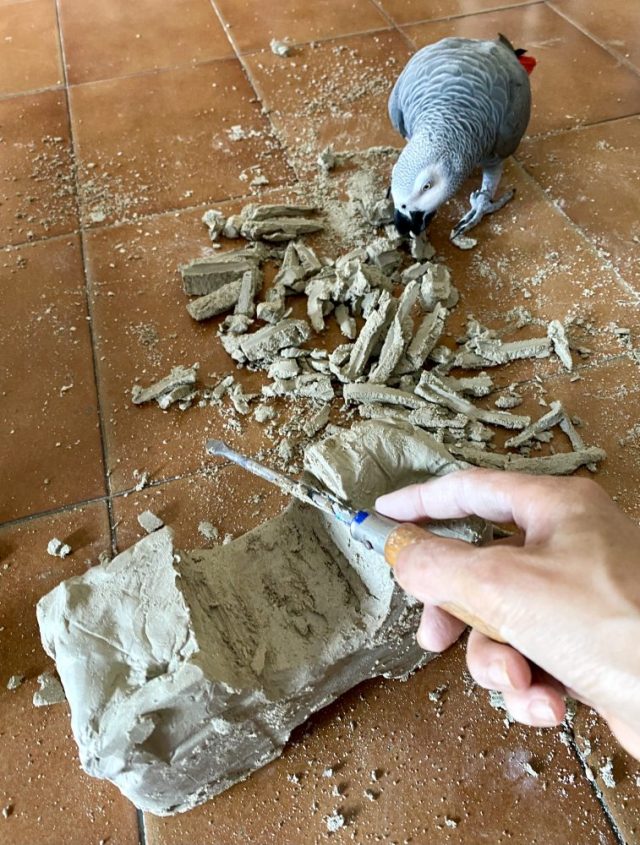 がんがん彫り進める。すぐに飛んでくるオウム。この好奇心や参加精神はすばらしいが、はっきり言って邪魔や!粘土、手、工具などに噛みついてくる〜(写真)。