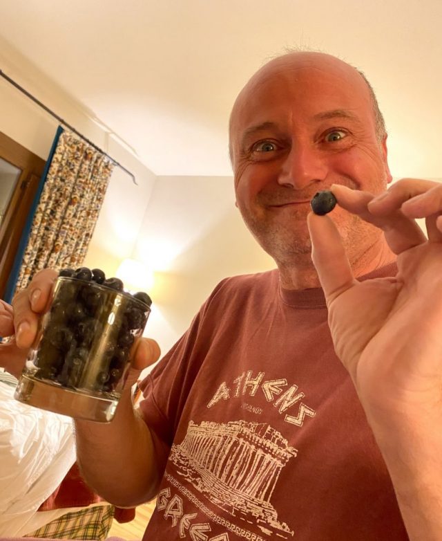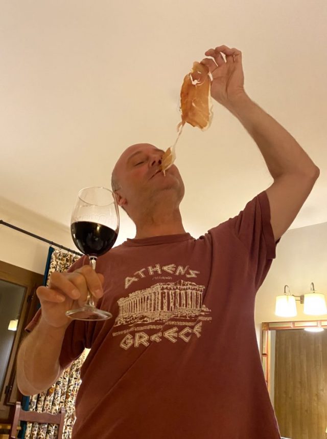 ベッドにひっくり返る私に「生ハムやフルーツ」を見せびらかすハビ吉(写真)。うれしそうやな。