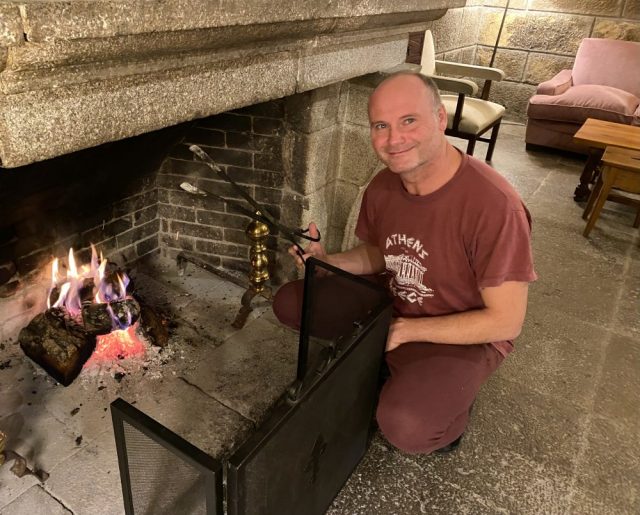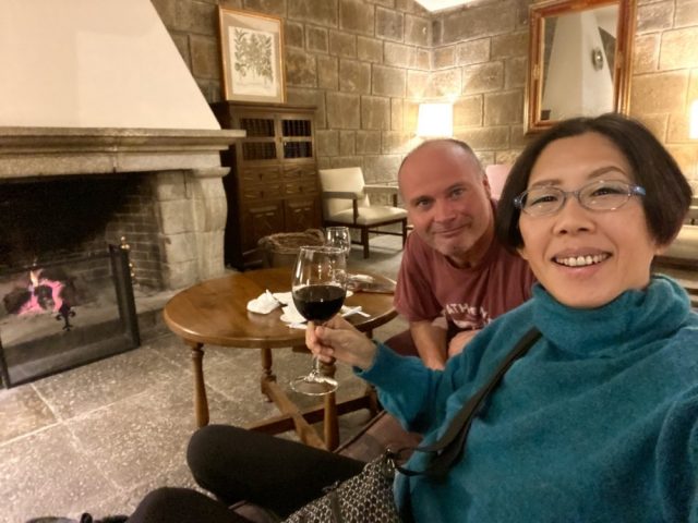 おぉお〜。暖炉に当たりつつ赤ワインで乾杯。「火が小さい」と文句を言いながら、ハビ吉が薪をくべ出した。係なんかい(汗)。ほっとしたら眠くなってきた。部屋に戻り、持ち込んだ食料で夕食。