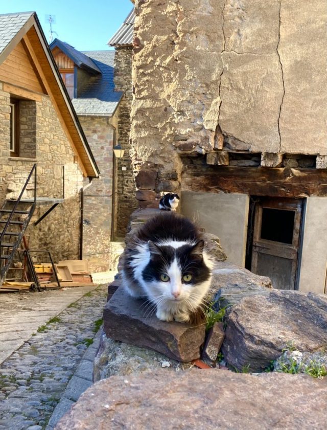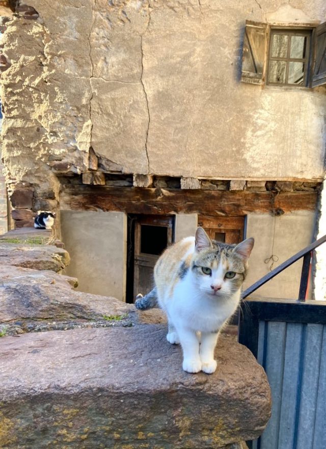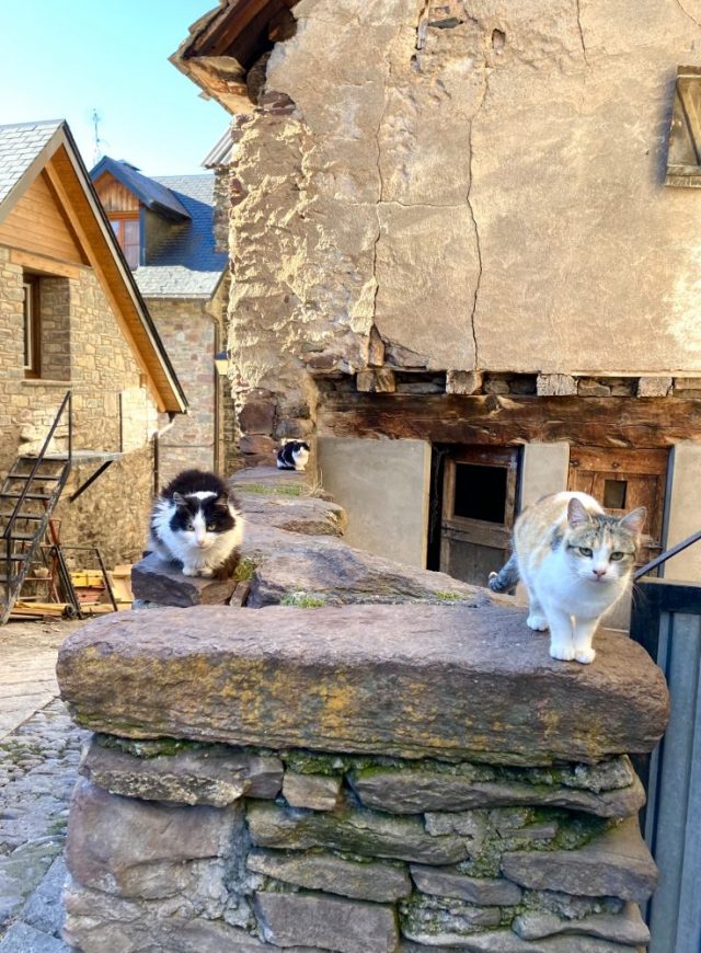 マラガでは腹式呼吸の大声なのに、ひそひそ耳元で会話をし合う私たち。のんびりくつろぐ猫ちゃんたちにお出迎えされ(写真)石造りの集落をぐるりとひと回り。