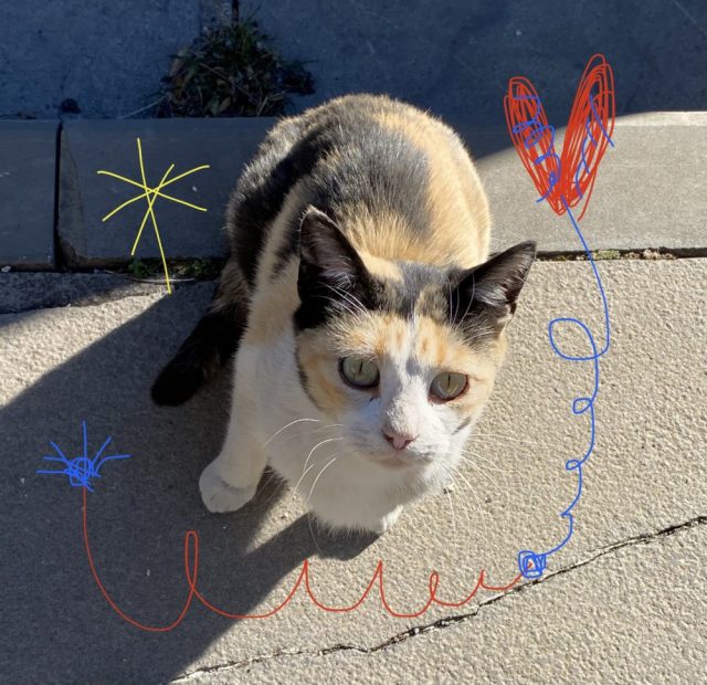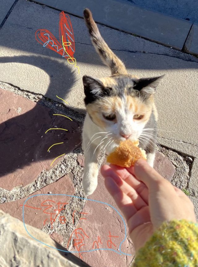 すごいな(笑)。お尻が冷たいのでジャケットを座布団に。「はい、カップケーキと水」。ハビ吉から朝食を手渡され、ガツガツと喰らう。その時、私の足元に1匹の子猫が現れた。