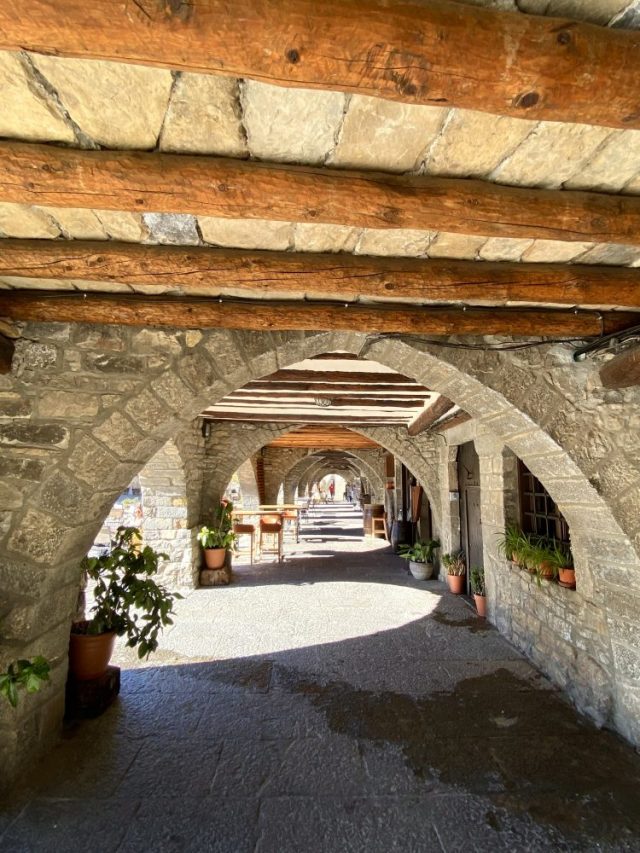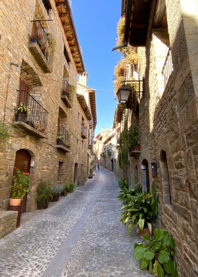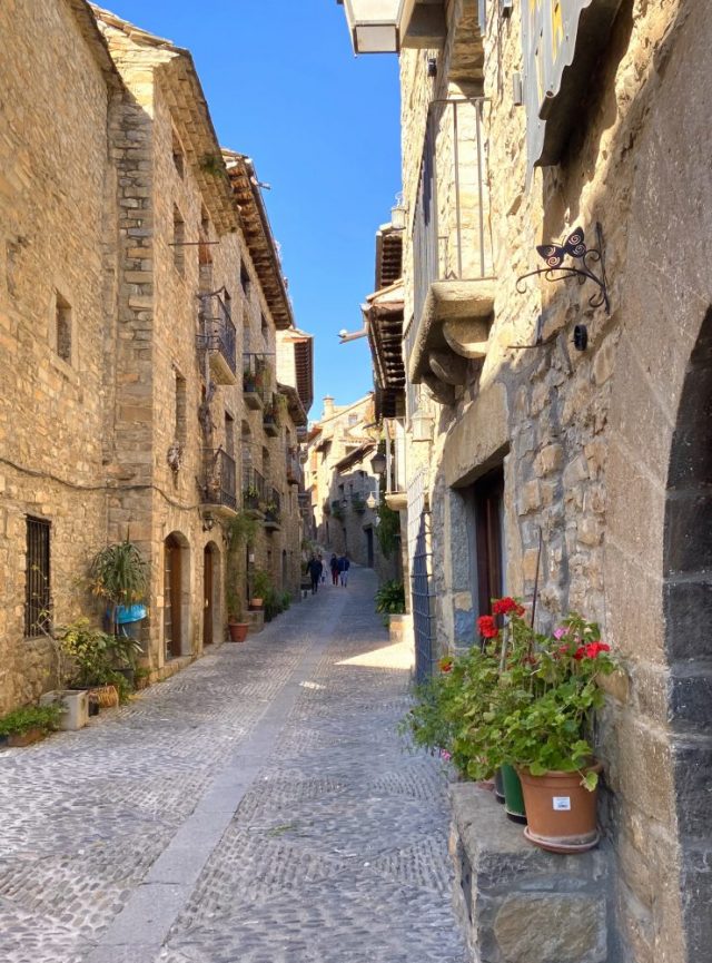 それだけで、ふつふつと歓びが(笑)。まずは、村の中心である「広場」をめざす。石畳の通り、鉢植えの花、バルコニー、ひなたぼっこをする猫・・・穏やかな時間が流れるアインサ村。