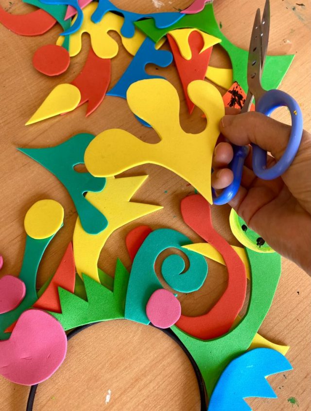 今日はハサミを片手に、ももパーツを切って貼って。カチューシャにくっつけて