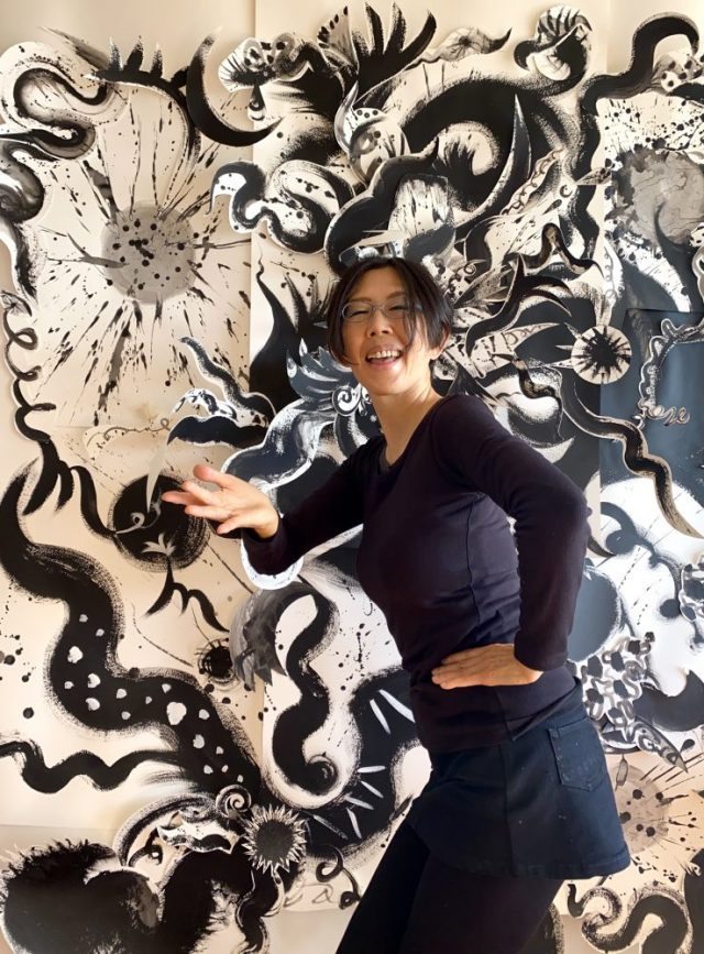 うちのアトリエの壁に「白地に黒」のコラージュアートが吊り下がっている(写真)。約2メートル平方。その前でよく写真を撮るけれど、こんな風に