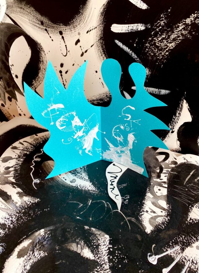 「Felices Fiestas」の文字が雪の中で隠れんぼ。雪から白い道が伸び、黒白の世界へ溶け込んでいく。紙を切ったり、折ったり、組み合わせたり。