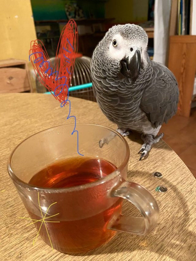 オウムがさっそくやって来た。実は、カップの底に残った冷めた紅茶を飲むのが好き(笑)。なんとか春には、父に会えますように。