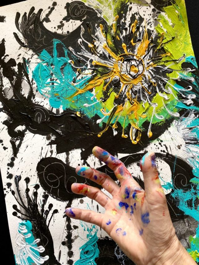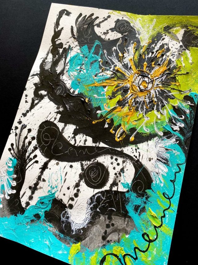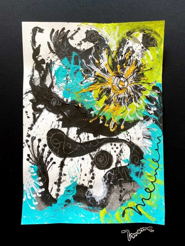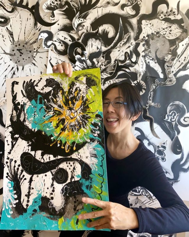 「夢」という文字であり「獣」でもある。自由と平和を求め、吠える。光の世界に向かって、全身を震わせ立ち向かう。まやかしに屈しない「魂」の舞。エールアート。