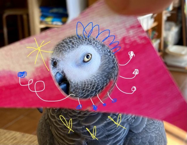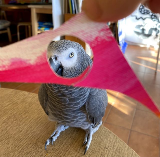 「遊んで」と、その顔は言っている。うちのオウムは、写真ではまぁまぁかわいく(時には聡明に)見えるのだが、恐ろしい破壊力を持っている。毎日必ず何かを壊す。一日一作(汗)。
