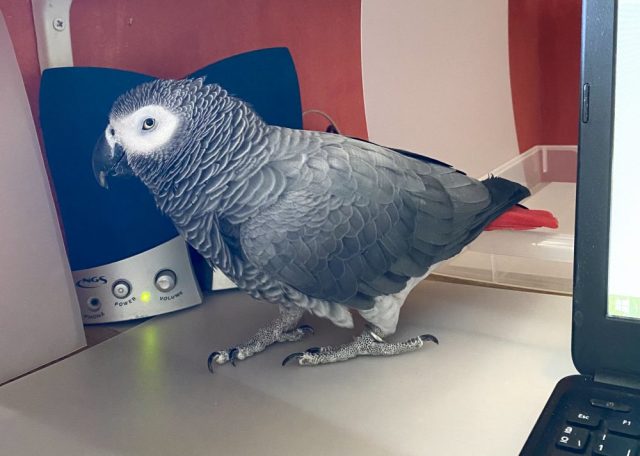 さて。パソコンで作業をしていると、さっそくオウムがやって来た。スピーカーの前がお気に入りのスペース(写真)。ここで音楽の波動にもまれるのが好き。実はこのスピーカー