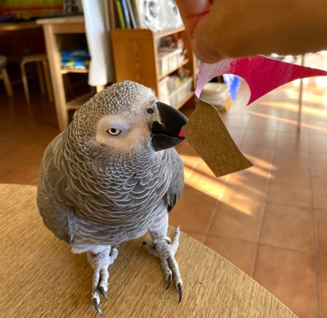 太陽の光を浴びていないから?なんとなく頭もぼんやり。湿度のせい?薄暗いから?久しぶりにベッドで昼寝(ソファがないため、たとえ20分でもベッド)。そしたらオウムもついて来た。その顔は